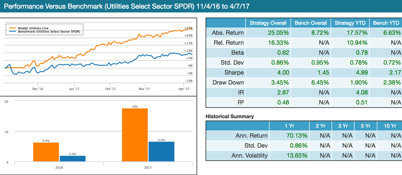 Image 3: Utilities based strategy– captured since November of 2016. Benchmark is XLU – Utilities select sector SPDR