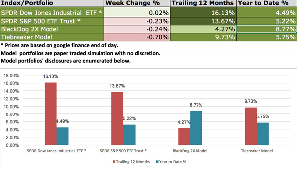 The table below presents the trailing 12-month performance and a YTD comparison between the two model strategies we cover in this newsletter (BlackDog and Tiebreaker), as well as the two ETFs representing the major US indexes (the DOW and the S&P).