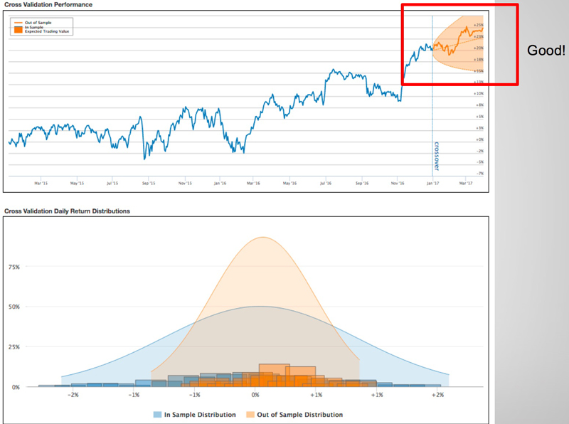 Image 6: Cross validating a live portfolio by assessing its analysis period against live trading. The cone in the above image represents the bounds of the expected performance of the live portfolio based on the training and backtest performance. The lower half demonstrates the daily return distribution of the in-sample and out of sample periods.