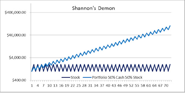 Shannon’s experiment is rather simple. Imagine you have a portfolio consisting of a single stock that either doubles or halves in value every day. Your portfolio is rebalanced daily by splitting your portfolio’s value in half: 50/50 between your single stock and cash. Assuming you started with $1,000 and the stock value is cut in half, your portfolio value at the end of the day would be $750. (Your cash remains at $500 while your stock was cut from $500 to $250 for a total of $750.) After rebalancing your portfolio the next day, it would have $375 in stock and $375 in cash. Assuming the value of the stock doubles the next day, your portfolio will now be valued at $1,125 (a net profit of $125).