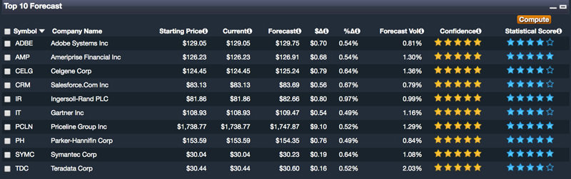 The top 10 forecast chart below delineates the ten positions in the S&P with the highest projected market-relative return combined with their highest confidence score.