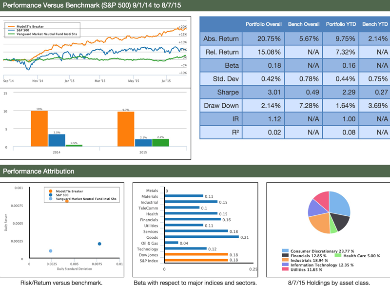 Tiebreaker: Model portfolio performance compared to S&P 500 and the Vanguard Market Neutral Institution fund VMNIX from 9/1/2014 to 8/7/2015.