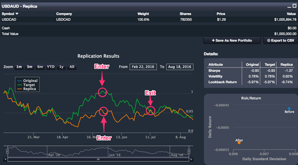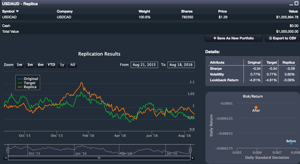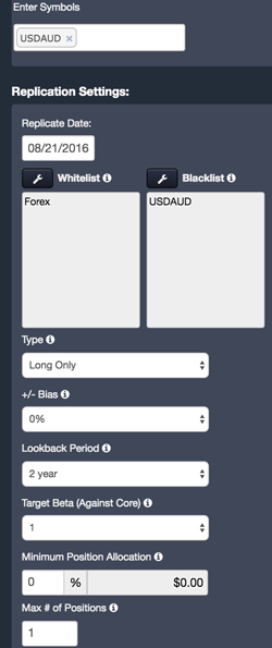 This can be done scientifically using our QuantDesk® replication engine. Suppose I’d like to find the most correlated currency pair to the USD/AUD (US Dollar & Australian Dollar currency pair).