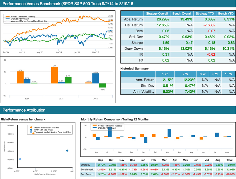 Tiebreaker: Paper trading model portfolio performance compared to the SPY and Vanguard Market Neutral Fund from 9/1/2014 to 8/19/2016.