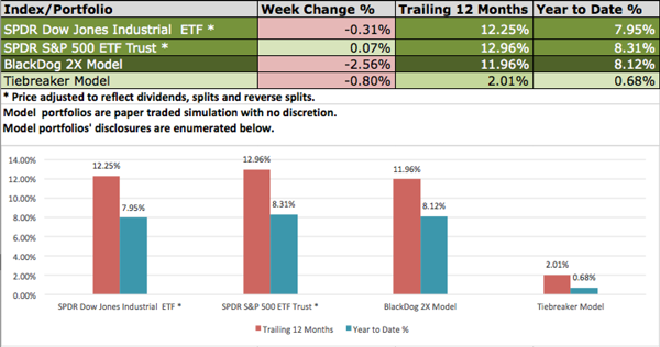 The table below delineates a trailing 12-month performance and a YTD comparison between the two model strategies we cover in this newsletter (BlackDog and Tiebreaker), as well as the two ETFs representing the major US indexes (the DOW and the S&P).