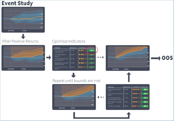 The backtest performance report below is of a strategy called BullPen 20. We share this particular strategy with our QuantDesk subscribers as a way to illustrate how effective event-based investment can be. The backtest simulates rolling back time and buying up to five positions per day and holding them for one month. The selection is made based on a qualified scan which screens the Russell 1000 for stocks with the highest probability to rise relative to the market (S&P 500). The scan definition, its factors, and their thresholds are the product of the process described in Image 3.
