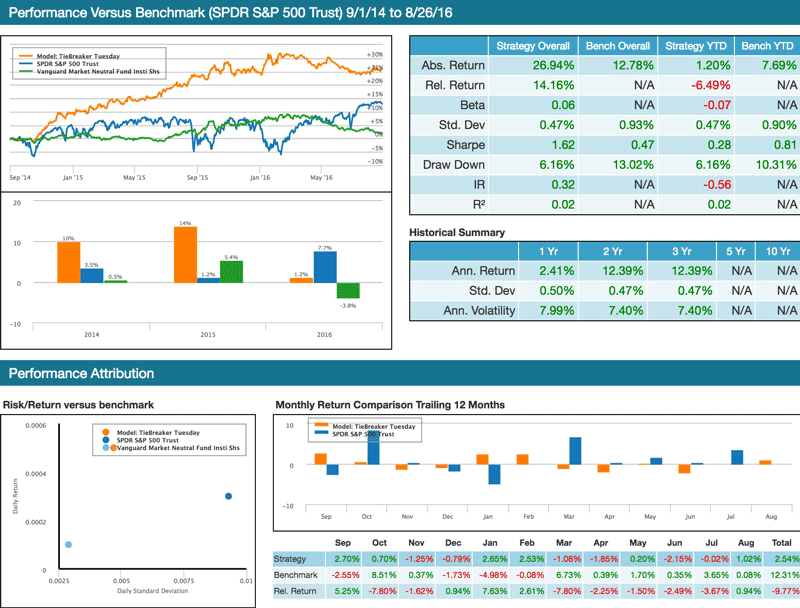 Tiebreaker: Paper trading model portfolio performance compared to the SPY and Vanguard Market Neutral Fund from 9/1/2014 to 8/26/2016.