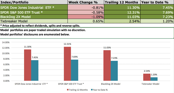 The table below delineates a trailing 12-month performance and a YTD comparison between the two model strategies we cover in this newsletter (BlackDog and Tiebreaker), as well as the two ETFs representing the major US indexes (the DOW and the S&P).