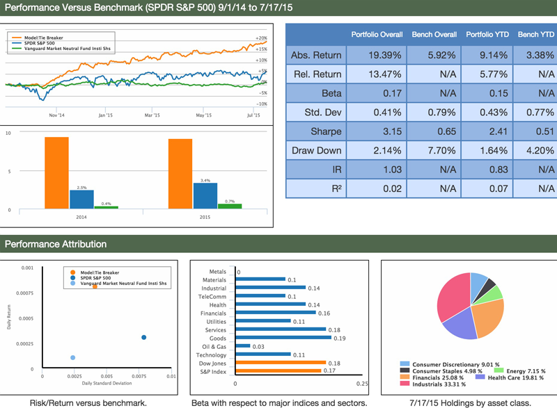 Tiebreaker: Model portfolio performance compared to S&P 500 and the Vanguard Market Neutral Institution fund VMNIX from 9/1/2014 to 7/17/2015.