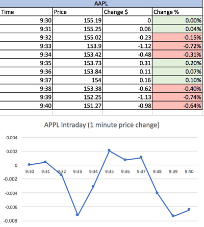 Let’s take a hypothetical scenario of APPL minute by minute price change on a certain trading day: