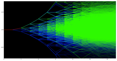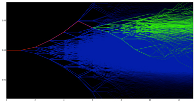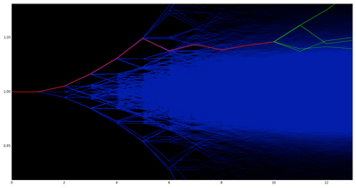 Image 3: After a period of time during the trading day (marked by the red ticks), we have eliminated all the non-conforming paths (marked in blue) while the green paths remain in contention.