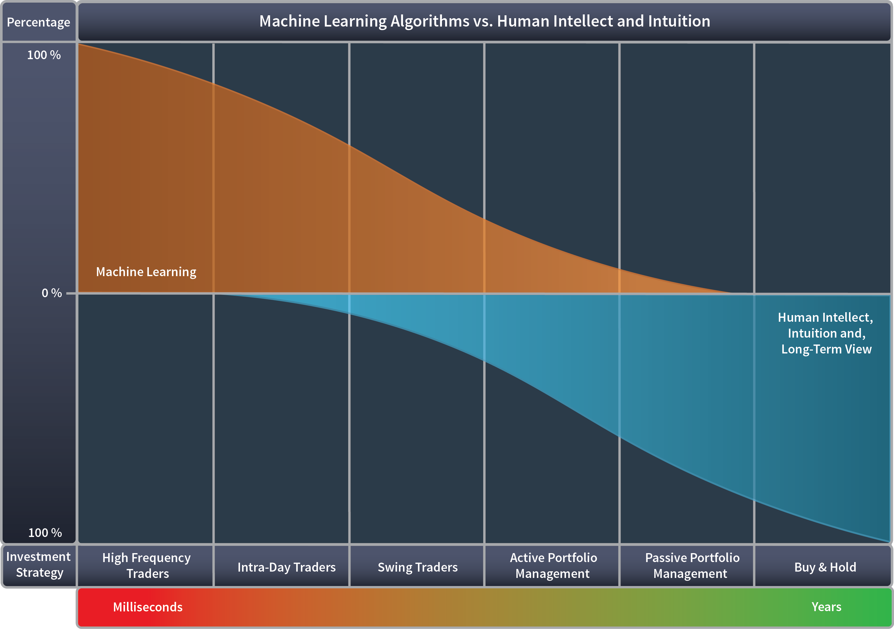 Business Philosophy: When looking at the spectrum of investment styles where on one end you have the Warren Buffets of the world advocating buy and hold strategies, and on the other end of the spectrum is the sub-second high frequency traders, the reliance on human insight gradually diminishes in favor of automation. A portfolio manager buying and holding on to a position for decades would normally rely more heavily on his/her intellect and foresight derived from some well thought out projections based on the likes of socioeconomic, geopolitical, and macroeconomic long term trends. On the other hand, at the microsecond level, human insights are literally nonexistent. The algorithm, although constructed originally by humans, makes all the decisions with virtually no human input.