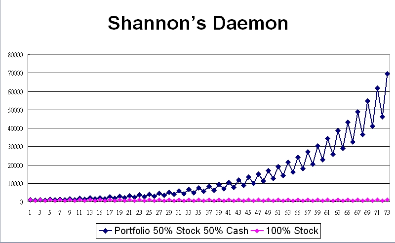 Image 3: As the chart demonstrates, after rebalancing only 72 times our initial $1,000 investment is now worth just under $100,000! In contrast, had you bought and held the stock without rebalancing and let it double and lose half its value every day, you would have made zero profit.