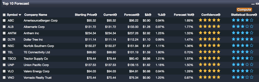 The top 10 forecast chart below delineates the ten positions in the S&P; with the highest projected market-relative return combined with their highest confidence score.